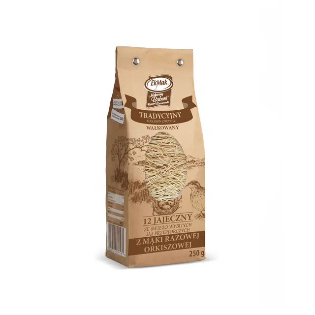 Makaron Przepiórczy z mąki orkiszowej produkowany jest w tradycyjnej rodzinnej manufakturze z dbałością o najwyższą jakość składników. Ten wyjątkowy makaron walcowany jak dawniej, nawiązuje do tradycji przekazywanej przez nasze mamy i babcie.
